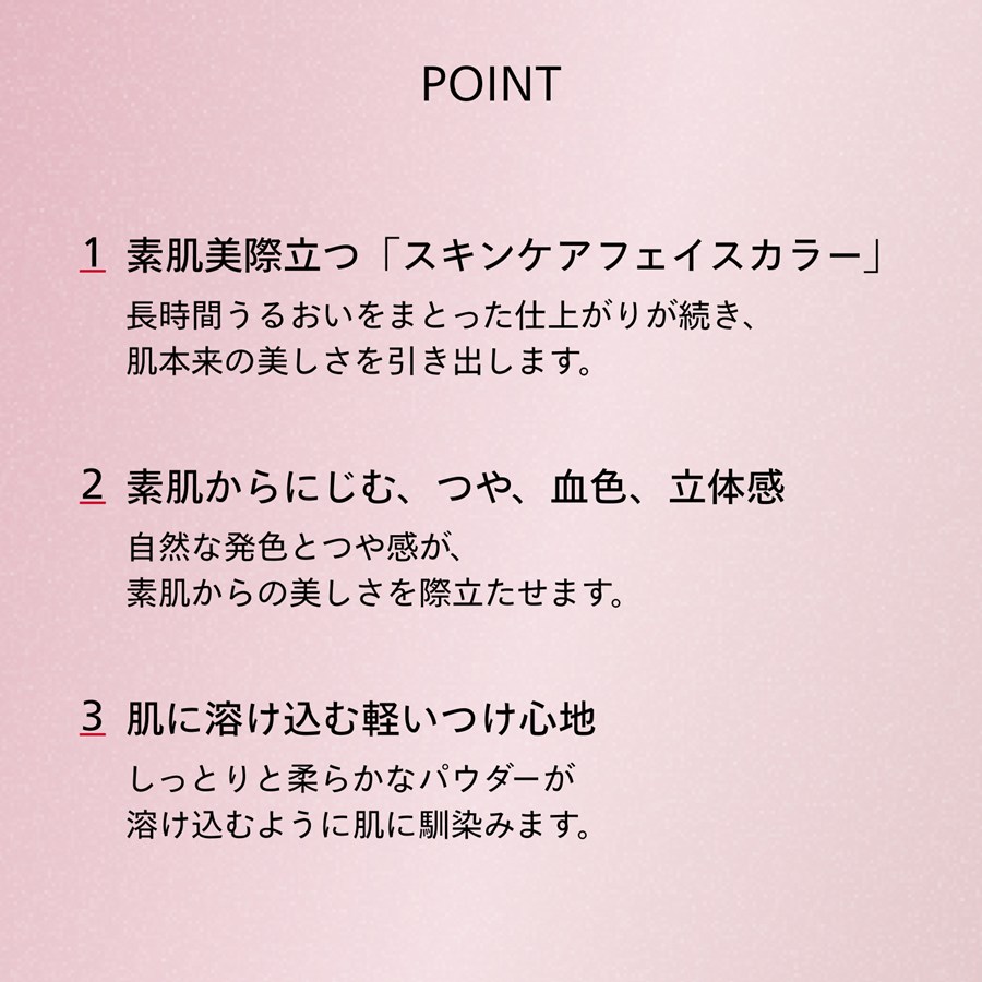 スキンケアリキッド配合のしっとりと柔らかなパウダーが、溶け込むように肌に馴染みます。