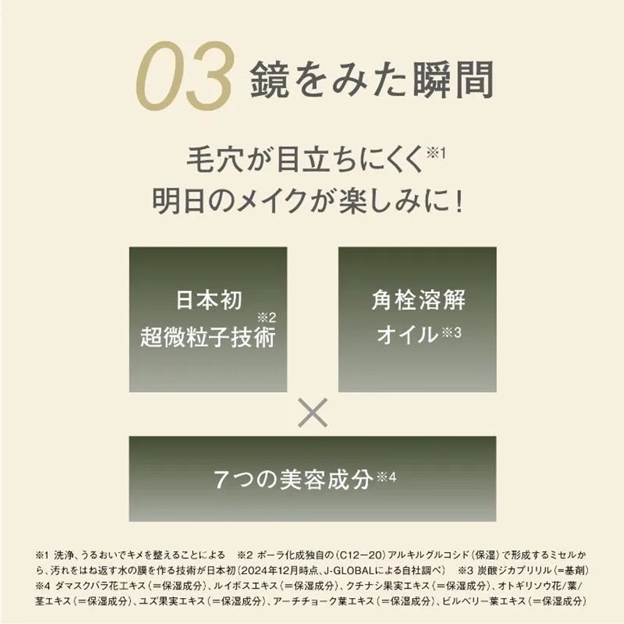 超微粒子が毛穴の凹凸まで入り込み、角栓溶解オイル(*5)が詰まりや黒ずみも溶かして、毛穴の目立たないすべすべ肌へ。