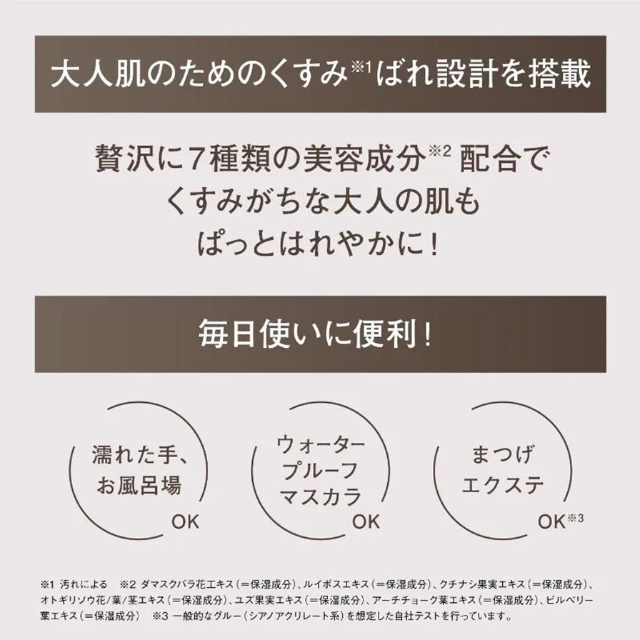 濃いポイントメイクもウォータープルーフメイクも、瞬時にオフ。マスカラ溶解オイル(*3)配合で、にじみ残りの心配もありません。
