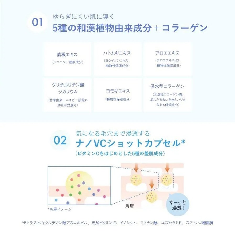 また、ビタミンC誘導体(*3)と5種の整肌成分(*4)から成る「ナノVCショットカプセル(*5)」で、浸透(*6)がアップ&毛穴の目立ちをしっかりケア(*7)。