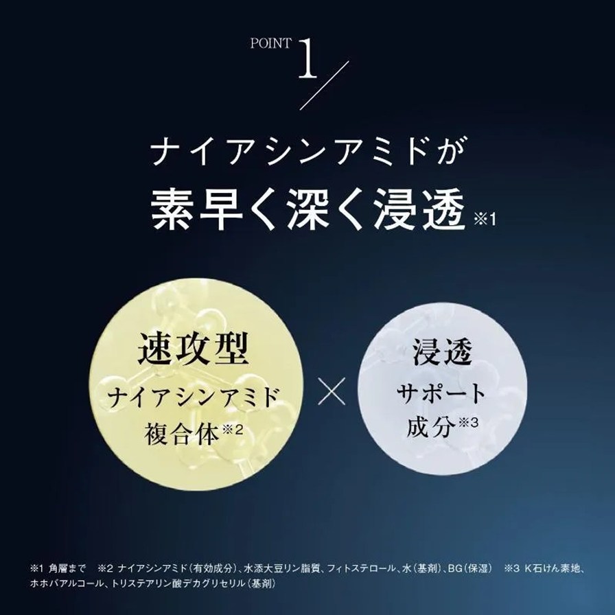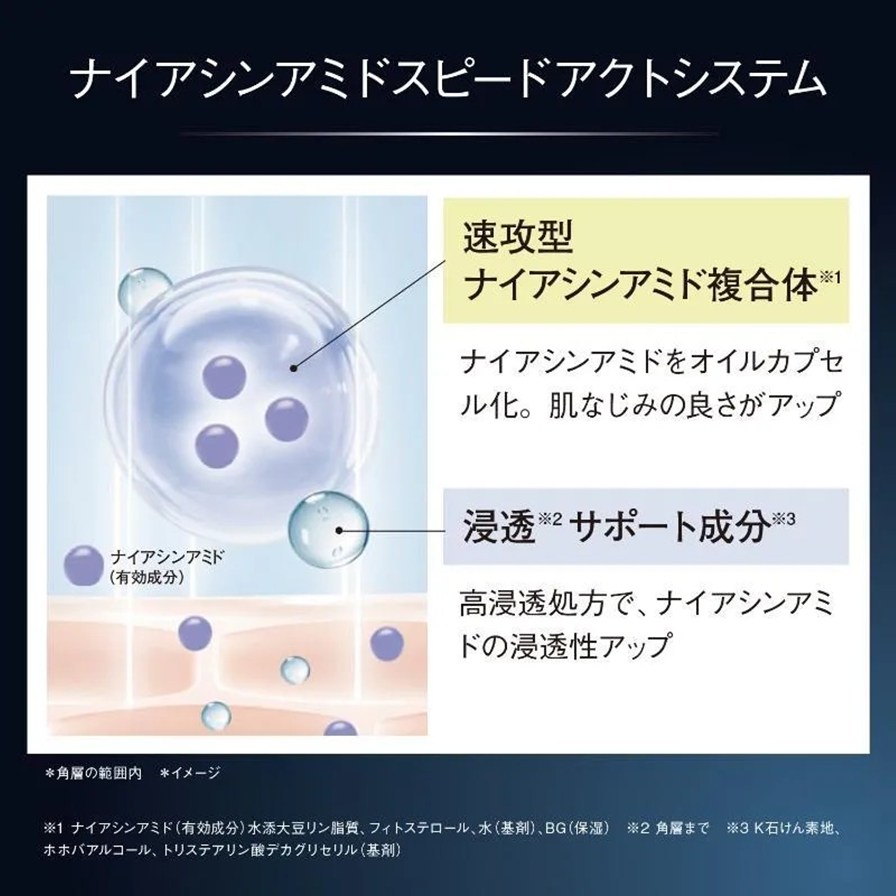 速攻型ナイアシンアミド複合体(*3)と浸透サポート成分(*4)配合。