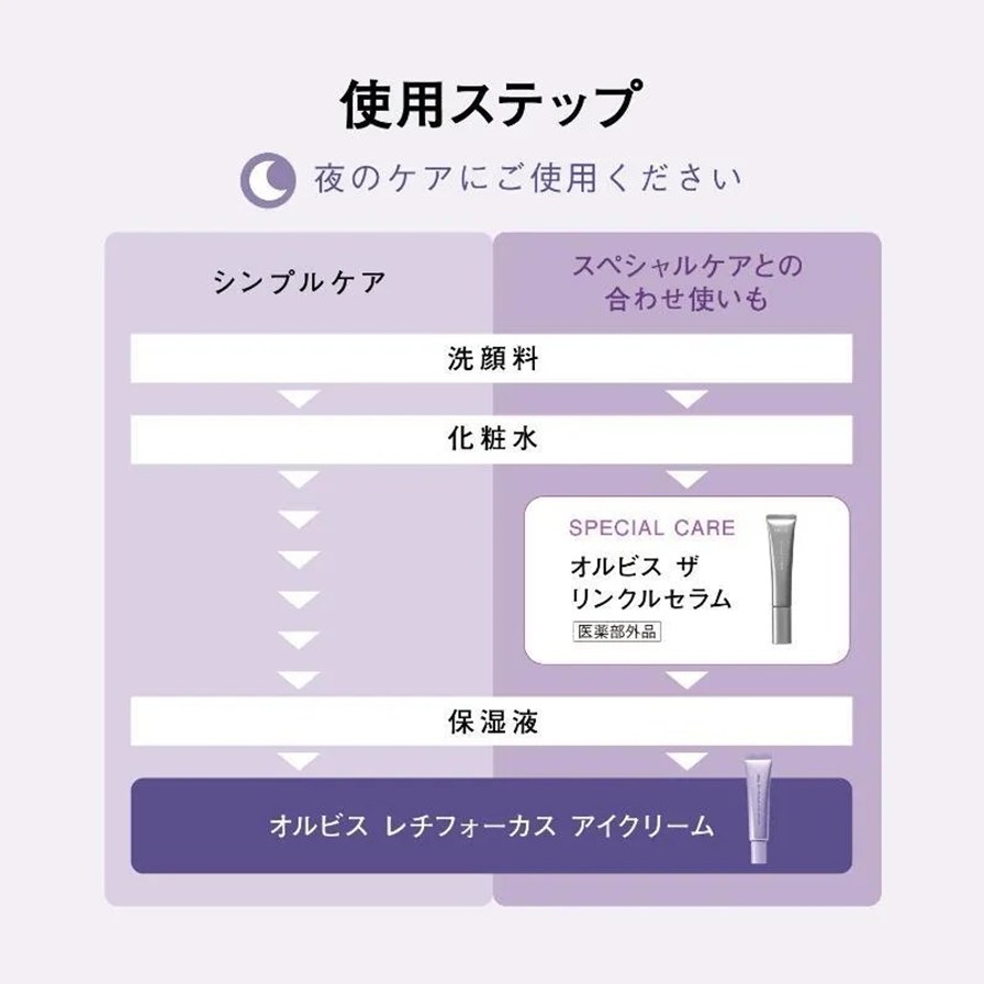 夜のスキンケアシーンにおいて、適量(パール 1 粒程度)をとり、目周り(目元や眉下から頬骨の高い位置、こめかみまで)に広げるように、やさしくなじませます。